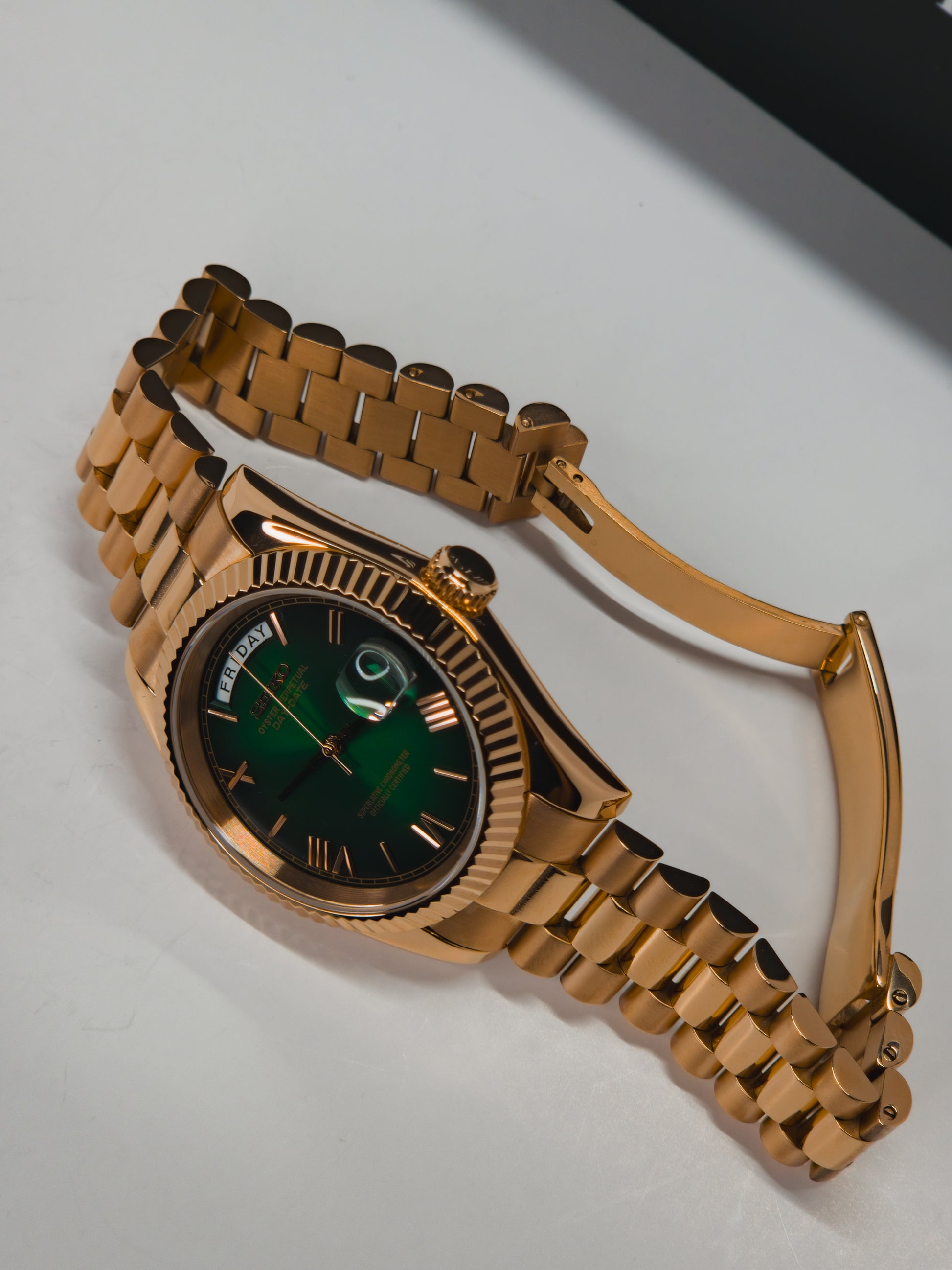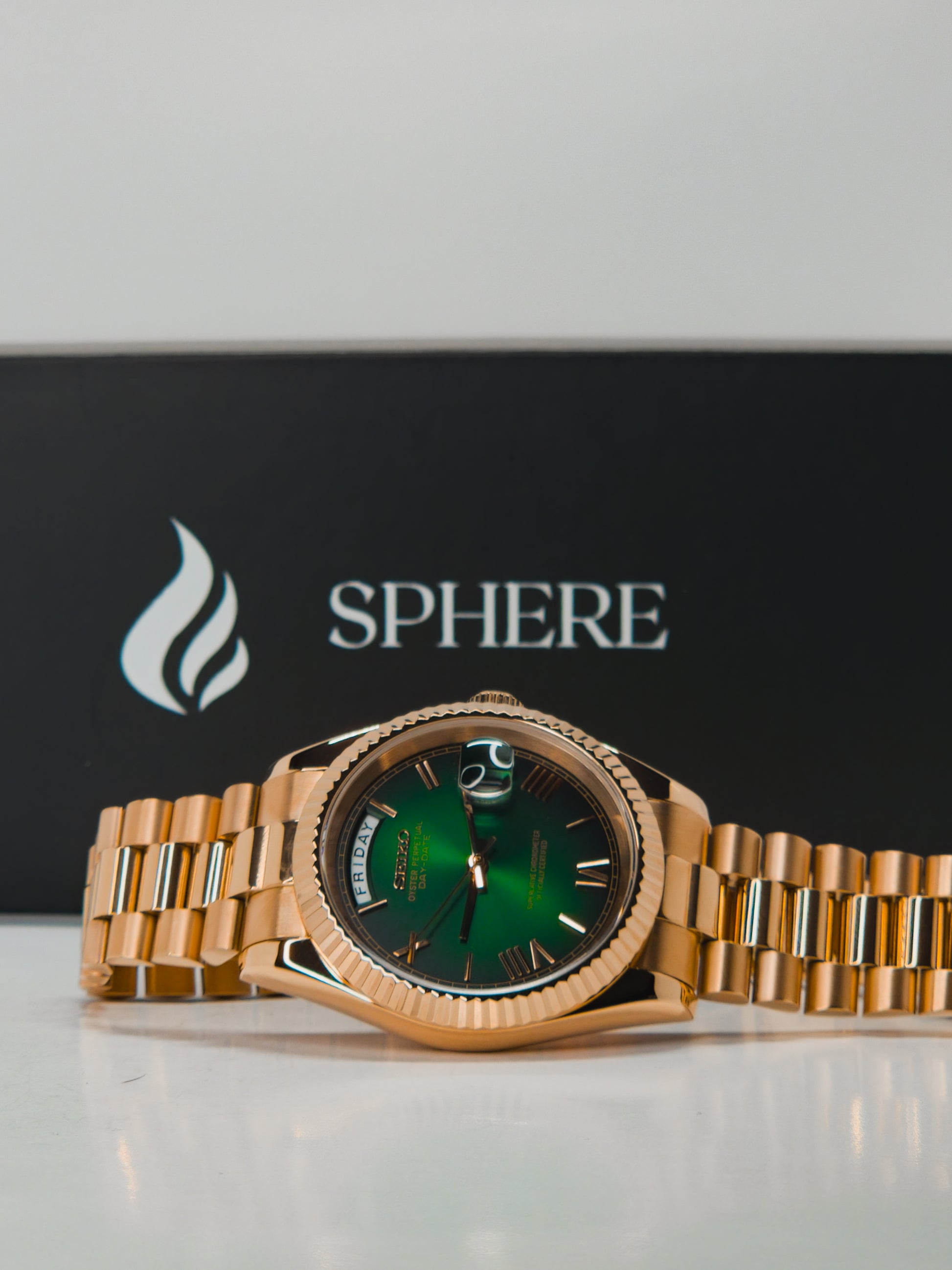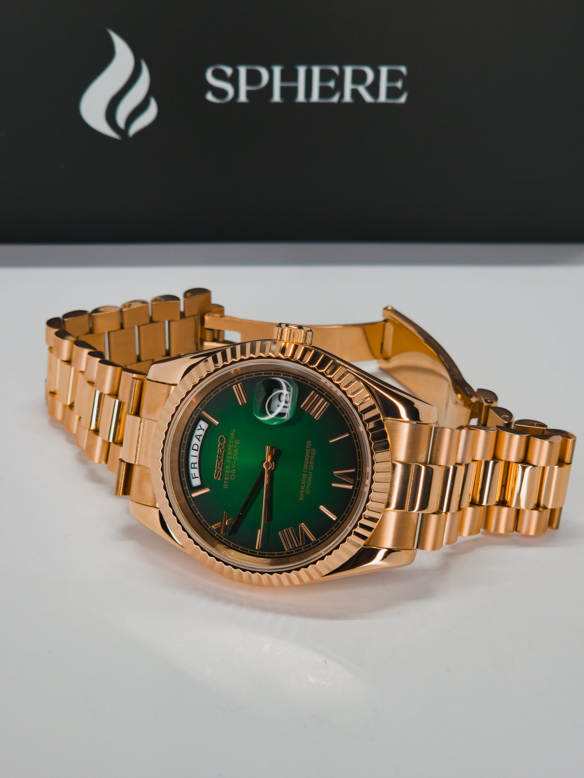 The Sphere Day-Date Rose Gold Green Gradient is a tribute to timeless prestige in watchmaking, reimagined for professionals who value elegance with mechanical precision.