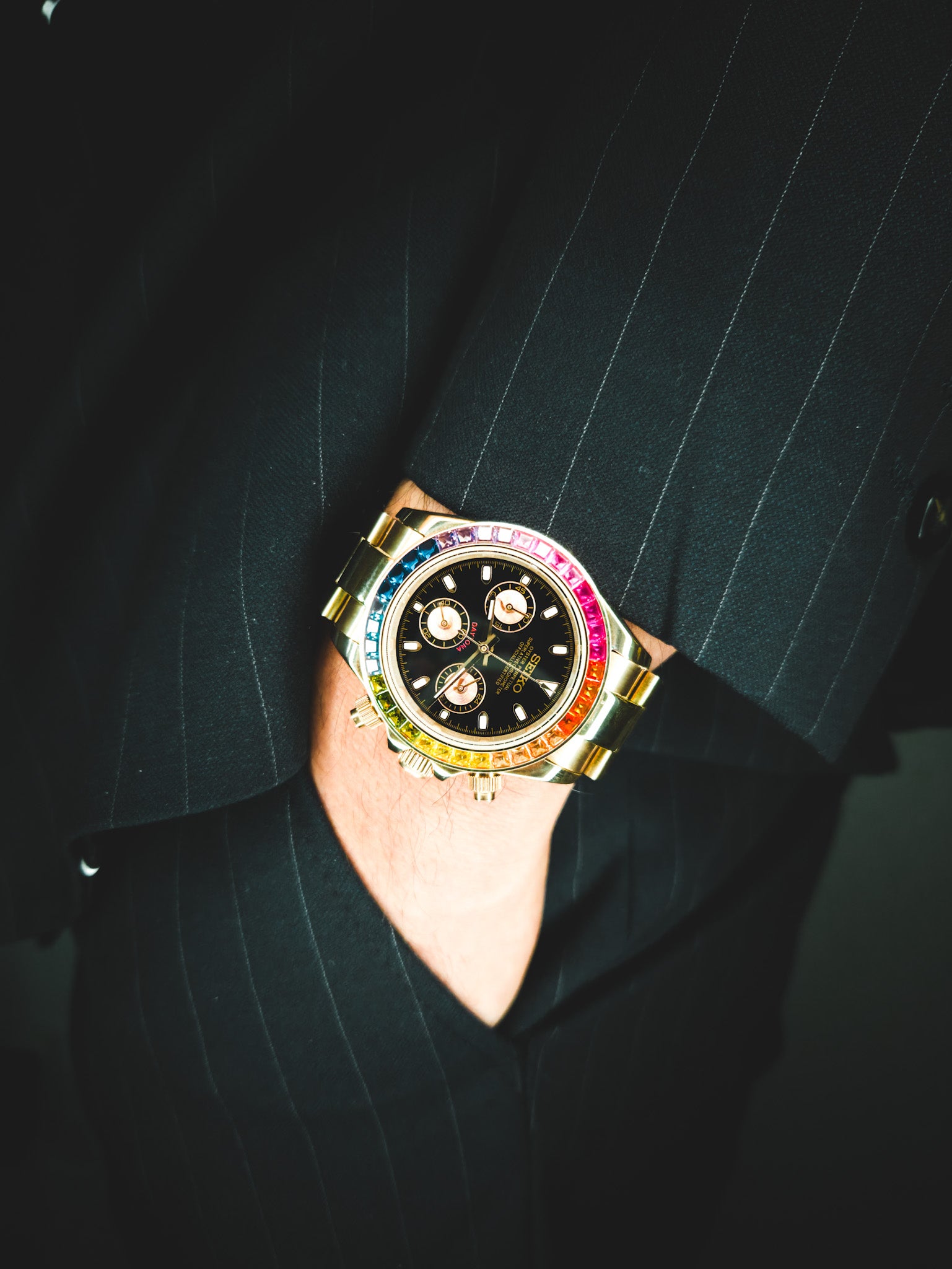 Its striking rainbow indices on a rose gold case make it a bold yet sophisticated statement, built for those who demand both speed and style in every detail.